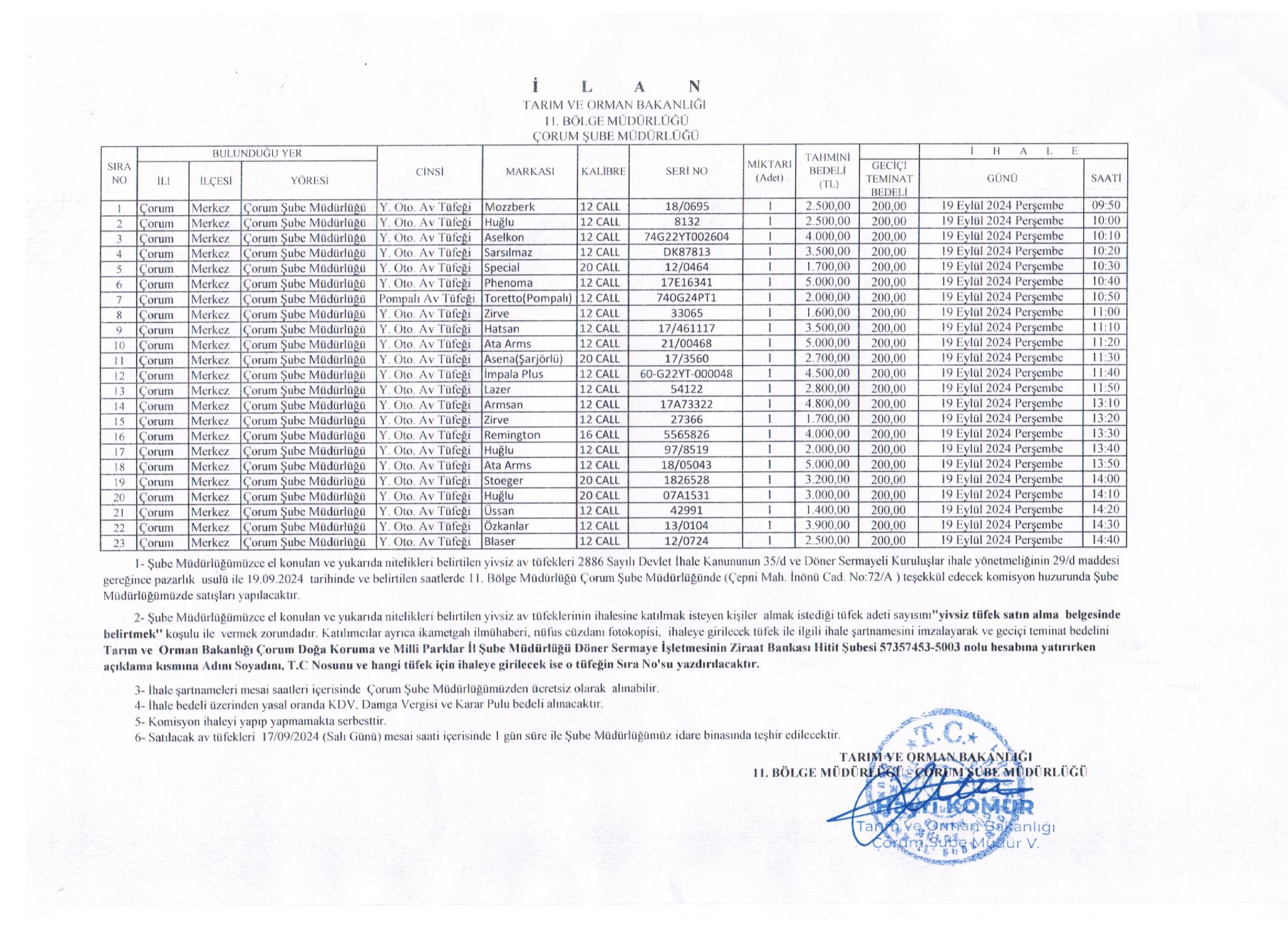 11. Bölge Müdürlüğü Çorum Şube Müdürlüğü Yivsiz Av Tüfeği İhale İlanı