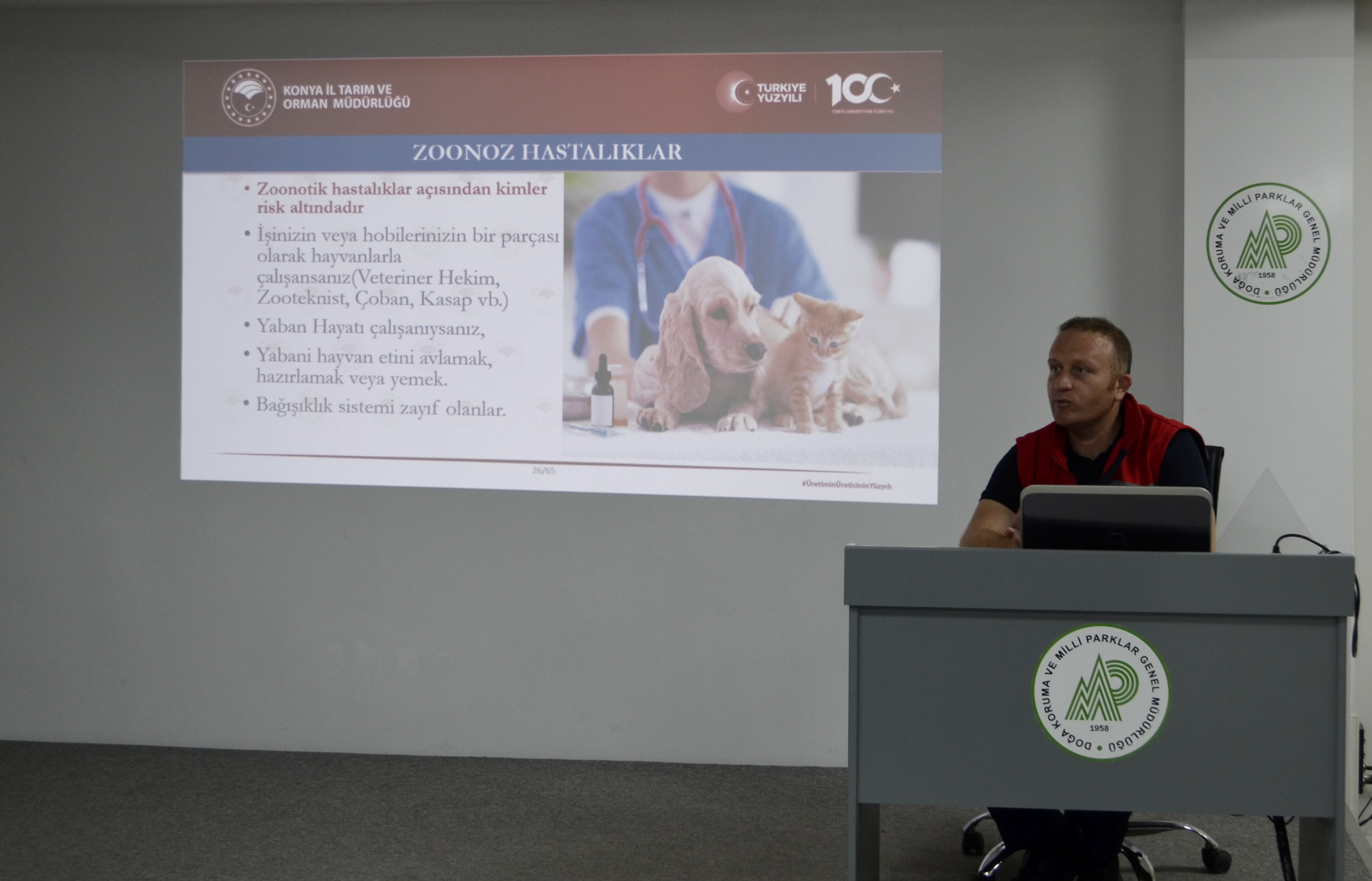 24.9.2025 tarihinde Bölge Müdürlüğümüz Konferans Salonunda Hayvanları Koruma Şube Müdürü Günay Çevik tarafından 5199 sayılı kanun ve CITES, Konya DKMP Şefi Yılmaz Çavuşoğlu tarafından 4915 sayılı kanun ve Konya İl Tarım Müdürlüğü Hayvan Sağlığı Şube Müdürlüğünde görevli Veteriner Hekimlerce zoonoz hastalıklar hakkında eğitim verilmiştir. Eğitime Konya DKMP Müdürü Burak Altınay, Konya DKMP Müdürlüğüne bağlı Şeflik personelimiz ve Veteriner Hekimlerimiz katılmıştır.