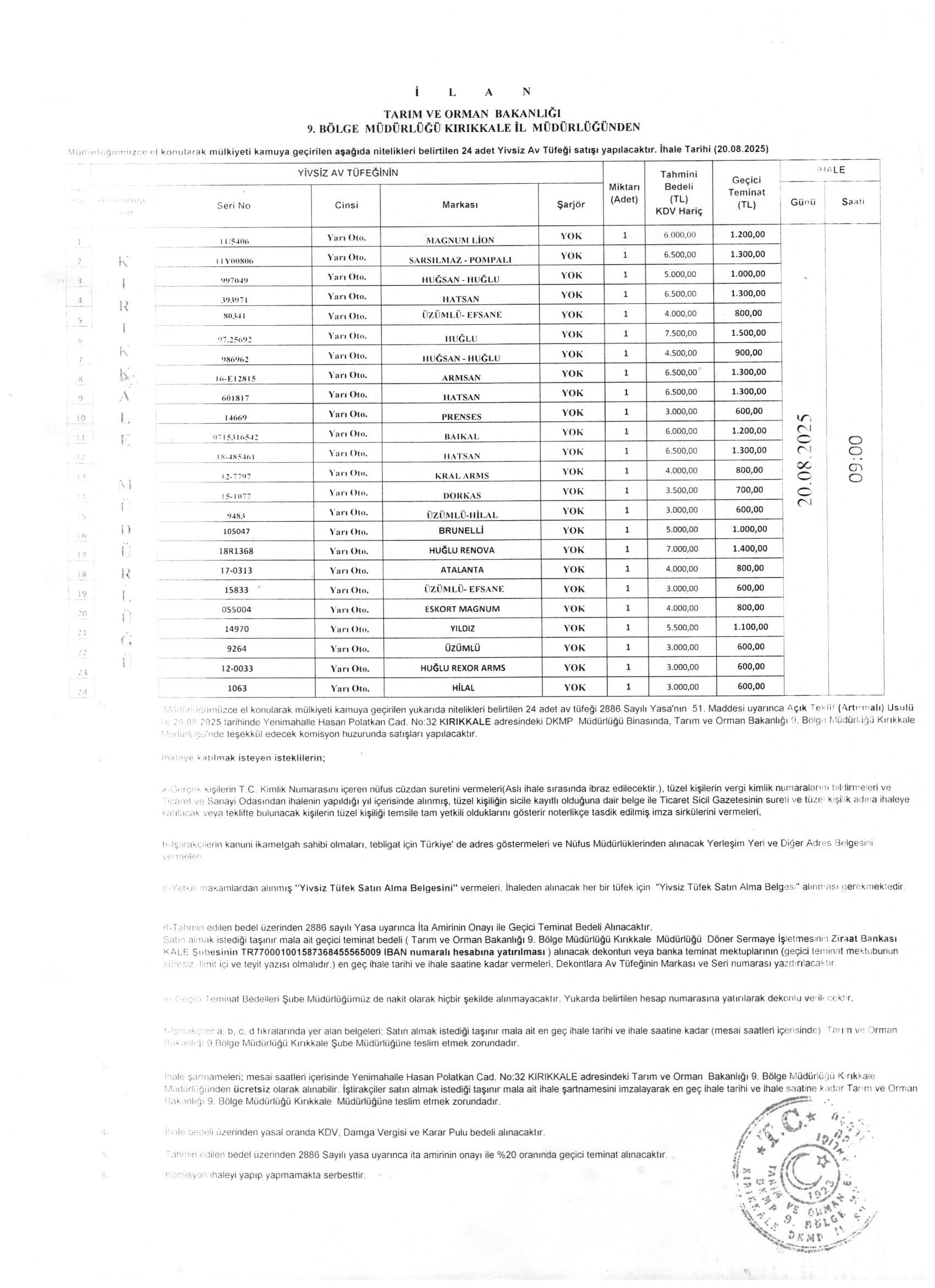 9. Bölge Müdürlüğü Kırıkkale DKMP Müdürlüğü Yivsiz Av Tüfeği İhale İlanı